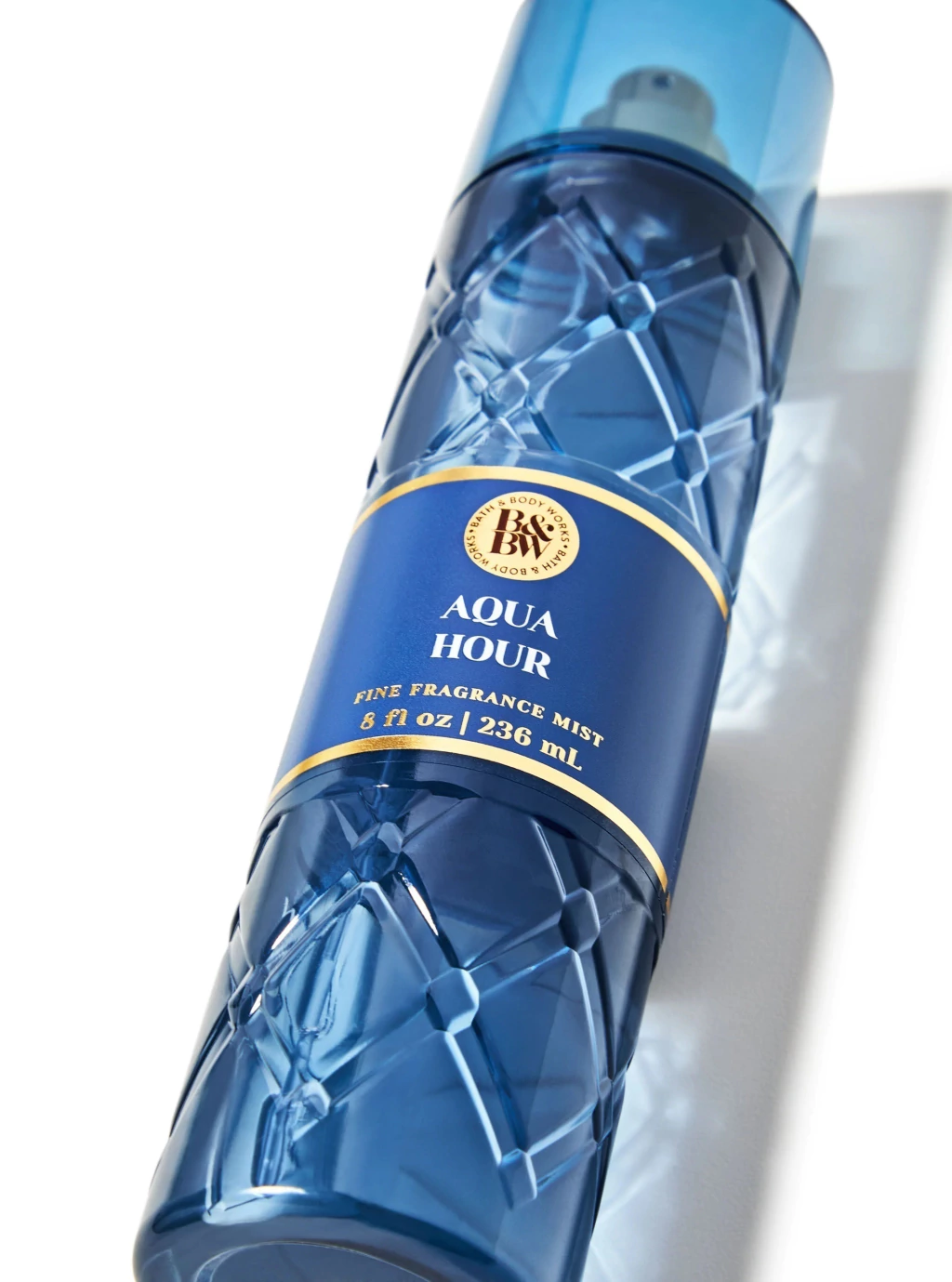 Descubre Aqua Hour Fine Fragrance Mist, una fragancia que te ofrece una tentadora invitación a zambullirte en un mar turquesa. Con una frescura inigualable, sus notas de bergamota acuática, peonía fresca y madera de cedro salada crean una experiencia olfativa que despierta tus sentidos y te transporta a lugares paradisíacos.