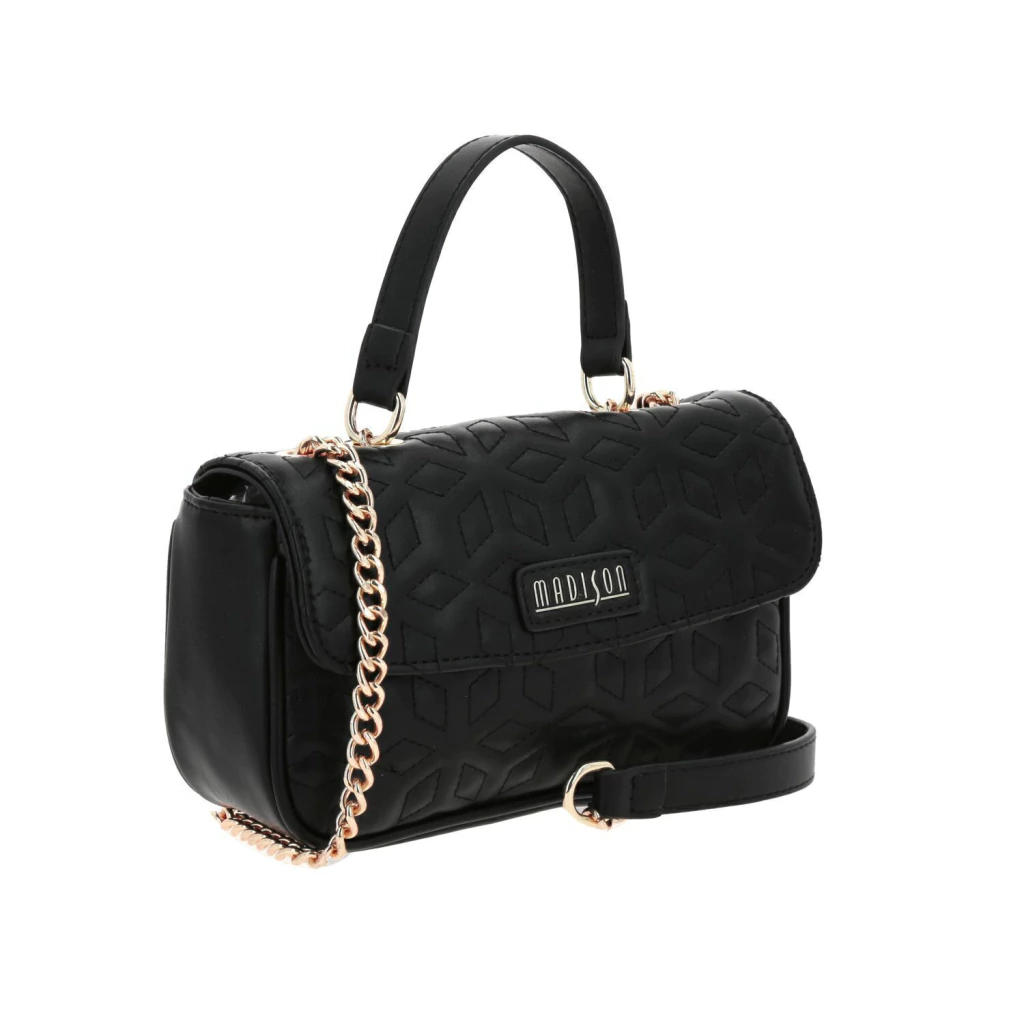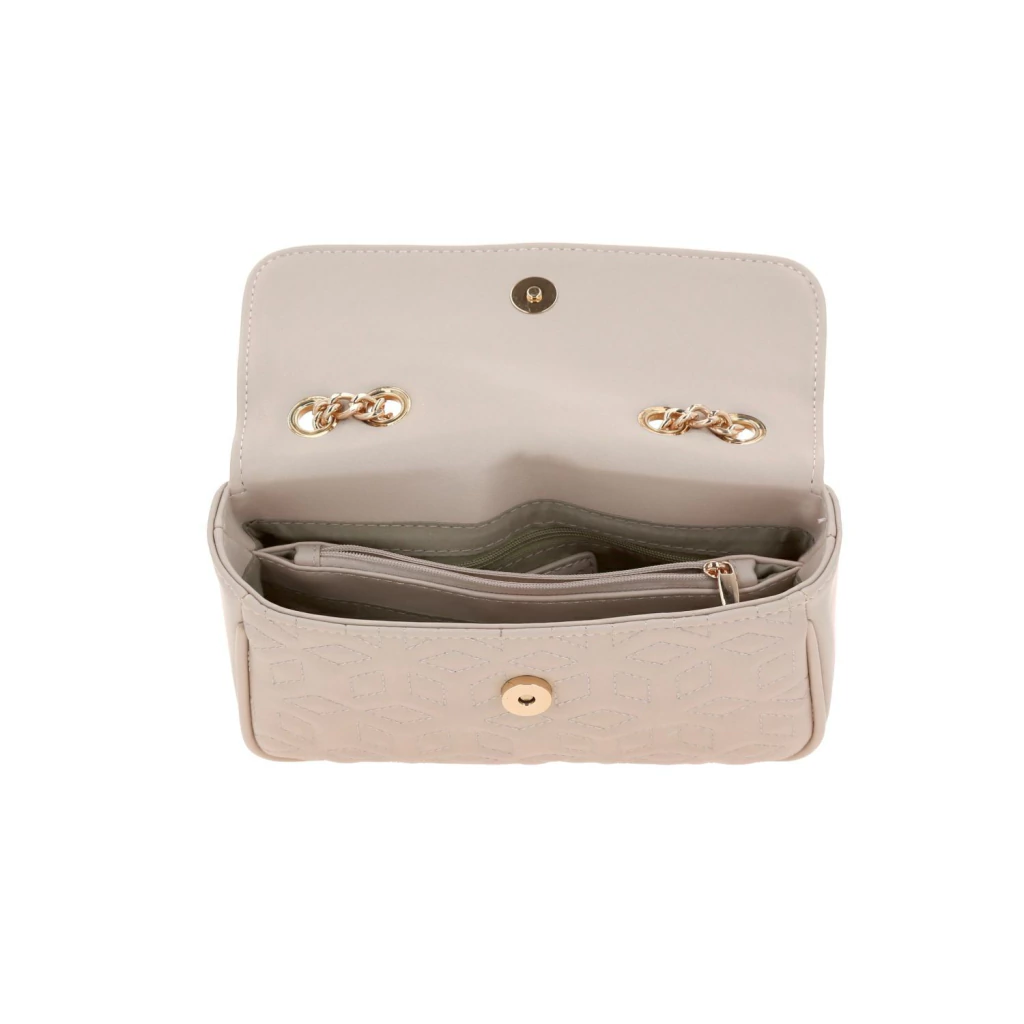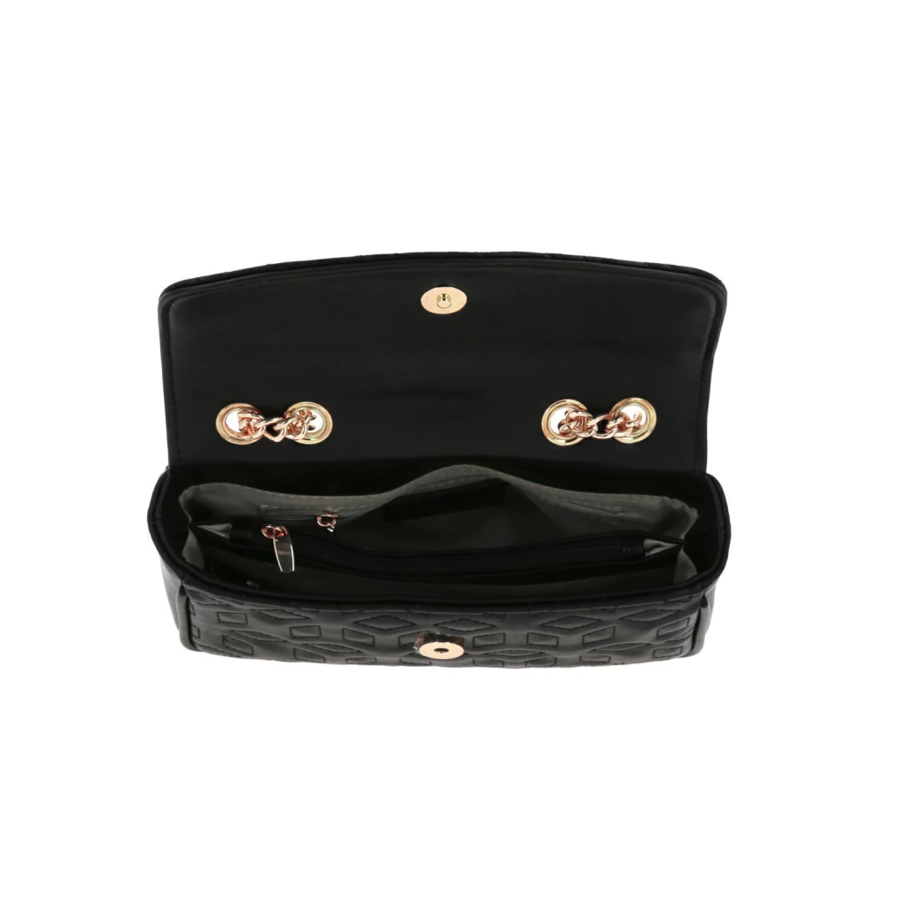 Con un diseño capitonado y elaborado en simil de piel 100%, este bolso es tan resistente como sofisticado. Sus medidas compactas, de 23 cm de largo, 15 cm de alto y 6 cm de ancho, lo hacen ideal para llevar lo esencial sin sacrificar el glamour.